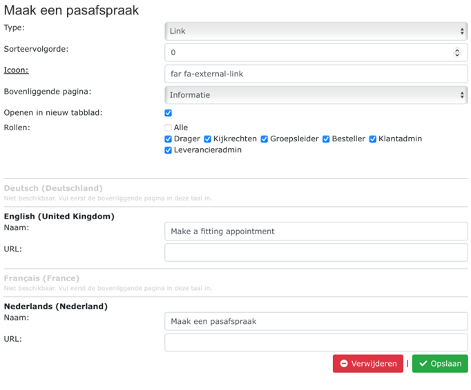 Let op: bij foutmeldingen kan het zijn dat het bovenliggende menu minder toegangsrechten heeft dan het nieuwe item. Controleer dan de ingestelde rollen.